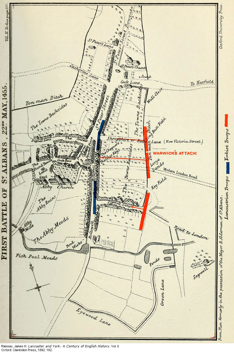 Receiving this uncompromising reply, York turned to harangue his troops. He declared that when their master refused them all reform, would not listen to their petitions, and threatened them with the traitor's shameful death, they had no alternative but to defend themselves by force of arms against the cruel malice of their enemies. Death in the field would be preferable to death on the scaffold. It was nearly noon when York formed his men in three columns, and attacked the barricades which blocked the three roads that led into St. Albans from the east. His first attempts to break in were beaten off with loss at all points. But the young Earl of Warwick, now for the first time displaying his quick military eye, had noted that although the royalists were strong enough to man the barricades, their numbers were but scanty to maintain the long straggling line of houses which formed the south-eastern part of their front. Gathering his retainers about him, he thrust his way through the closes and gardens of the houses of Holwell Street, and bursting open several of their back doors ran out into the main thoroughfare of the town "between the sign of the Key and the sign of the Chequers," with shouts of "A Warwick! A Warwick!" and trumpets sounding.