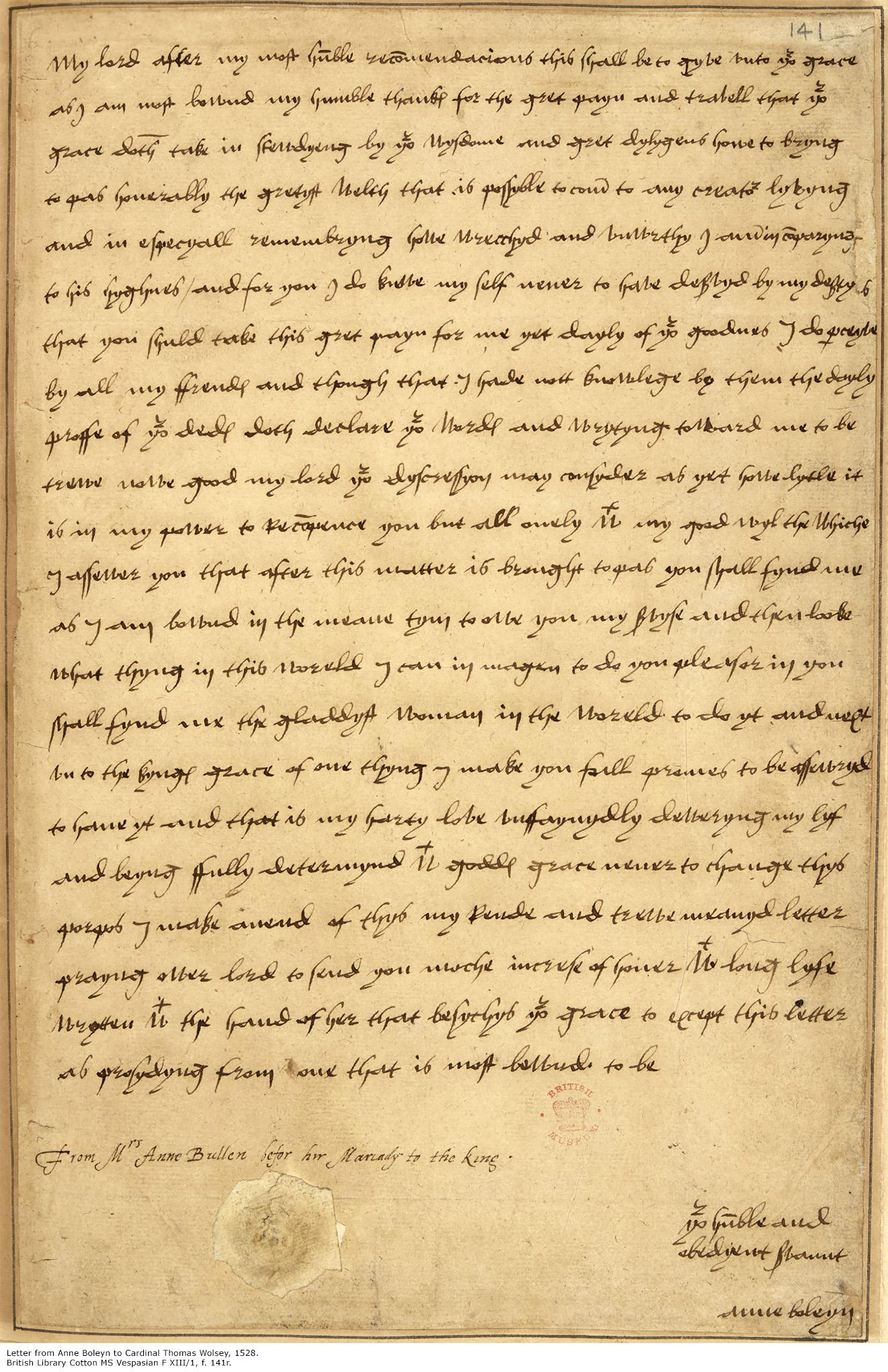 Letter of Anne Boleyn to Cardinal Wolsey, 1528.1