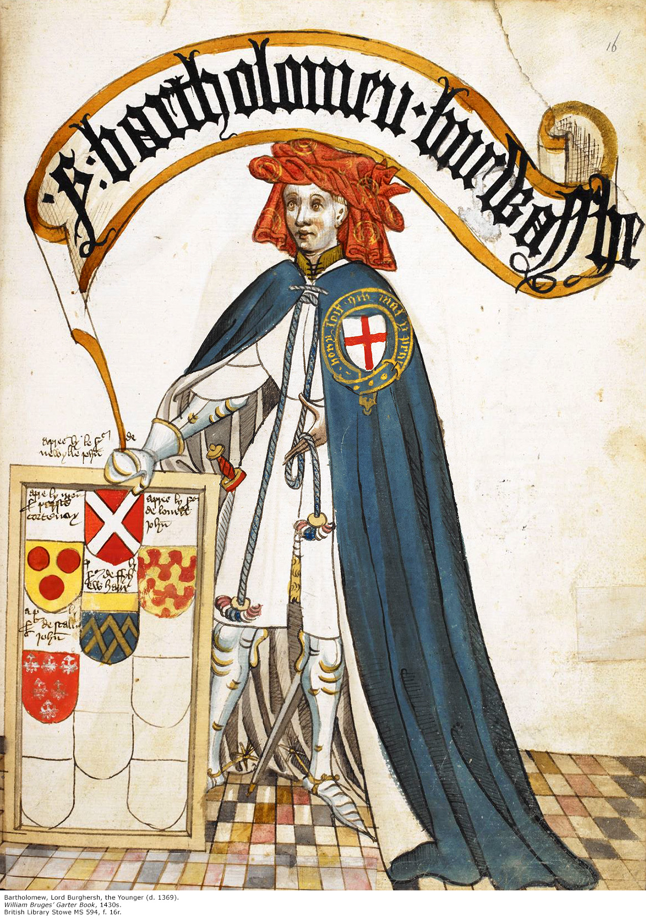 Manuscript portrait of Bartholomew, Lord Burghersh, the Younger, from William Bruges' Garter Book, 1430s. British Library.