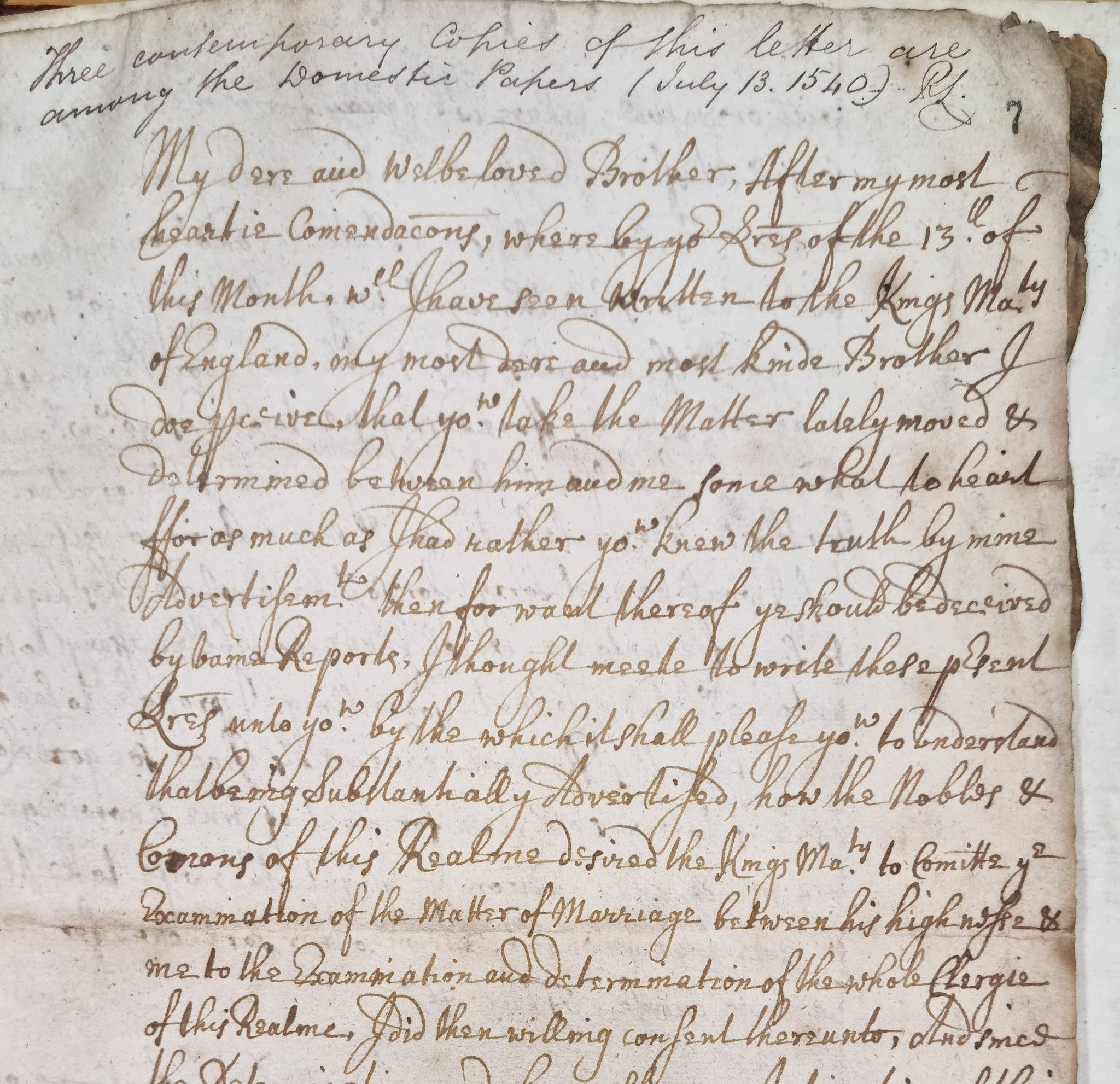 "My dear and wellbeloved brother. After my most hearty commendations, where by your letters of the 13th of this month