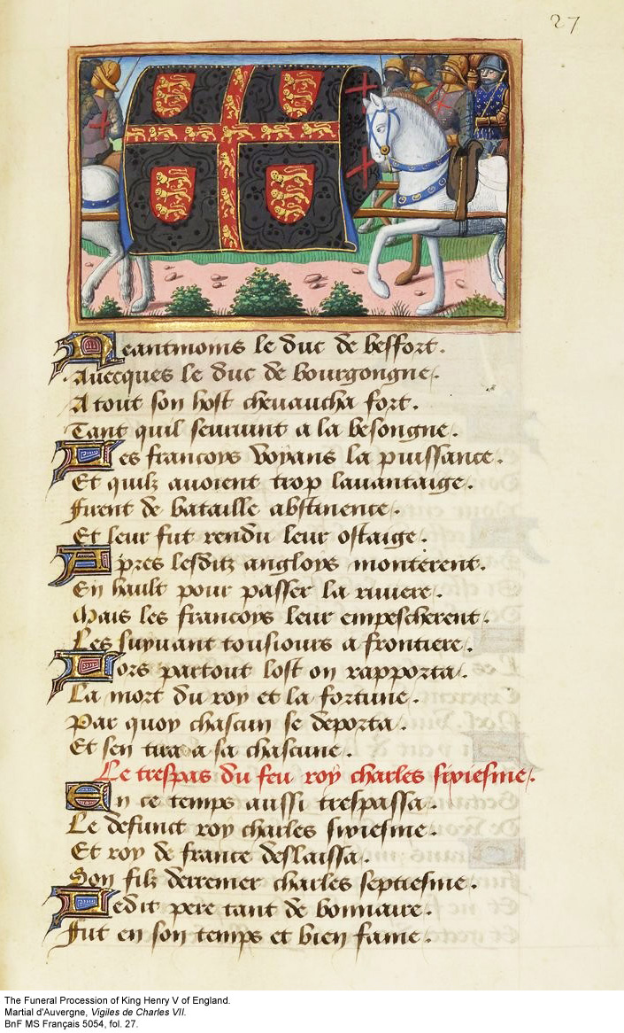 The hardships of the longer winter siege of Meaux broke down his health, and he died at Bois de Vincennes on the 31st of August 1422.