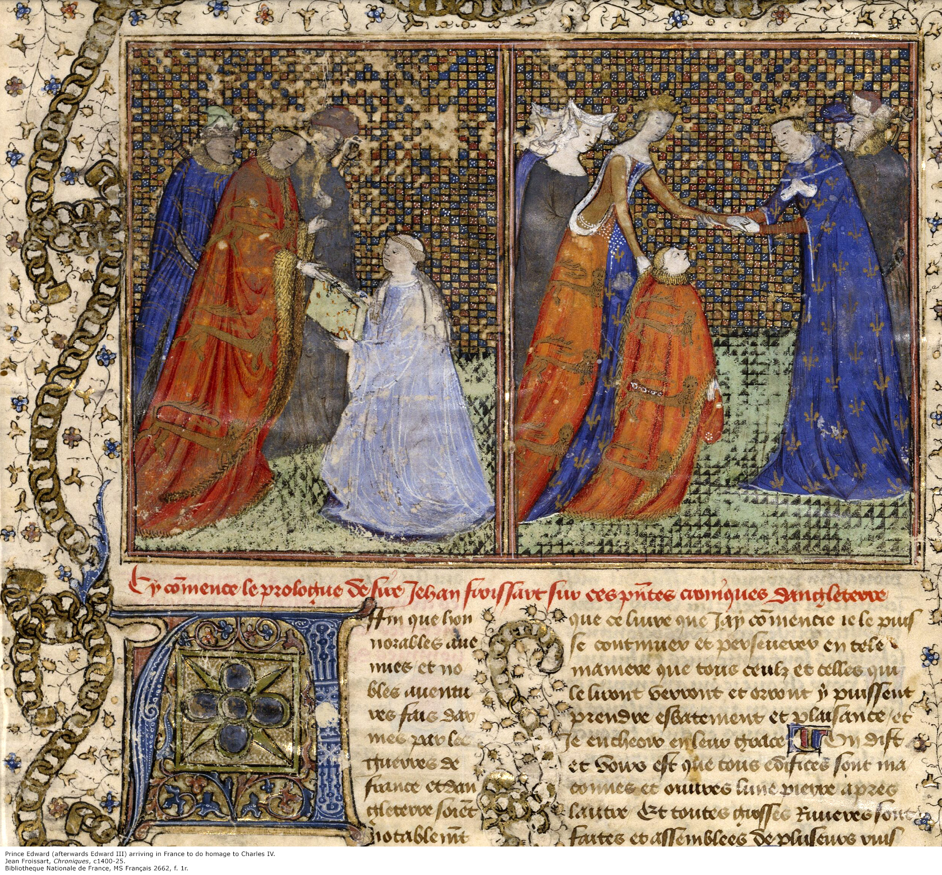 Queen Isabella being received by her brother, Charles le Bel, in France.