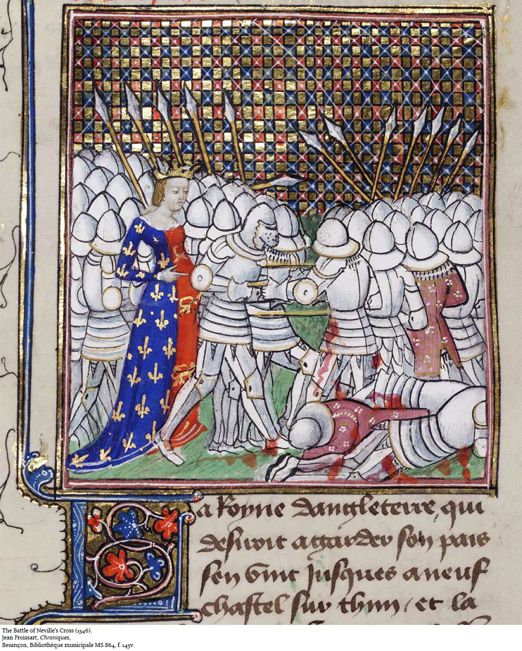 and taken prisoner at the battle of Neville's Cross, near Durham, on 17 Oct. 1346. Jehan