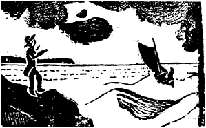 The dancing skiff puts forth to sea.