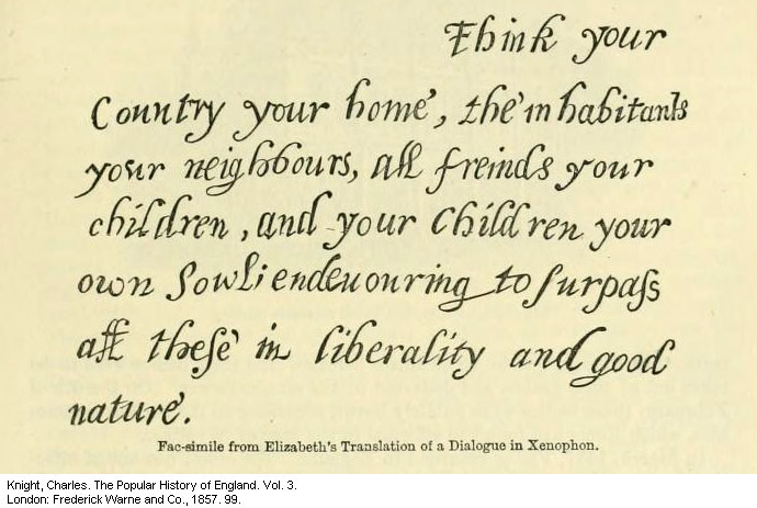 * [AJ Note: The translation in question was first attributed to Queen Elizabeth by Horace Walpole in the eighteenth century. In their volume of Queen Elizabeth's translations, Mueller and Scodel omit this text, standing with Leicester Bradner: "Leicester Bradner has convincingly argued that a translation of Xenophon's Hiero once thought to be hers is not Elizabeth's; see "The Xenophon Translation Attributed to Queen Elizabeth I," Journal of the Warburg and Courtauld Institutes 27 (1964): 324-26."1 In an interview, Mueller and Scodel also state that the manuscript is not in Elizabeth's handwriting; see Book of translations reveals intellectualism of England's powerful Queen Elizabeth I by Seth Sanders, The University Chicago Chronicle, 10 Oct 2002. Walpole had explained this away with "She sometimes took the pains to write exceedingly fair"; see The Works of Horatio Walpole, Vol I. London: G. G. and J. Robinson, 1798, 268.]