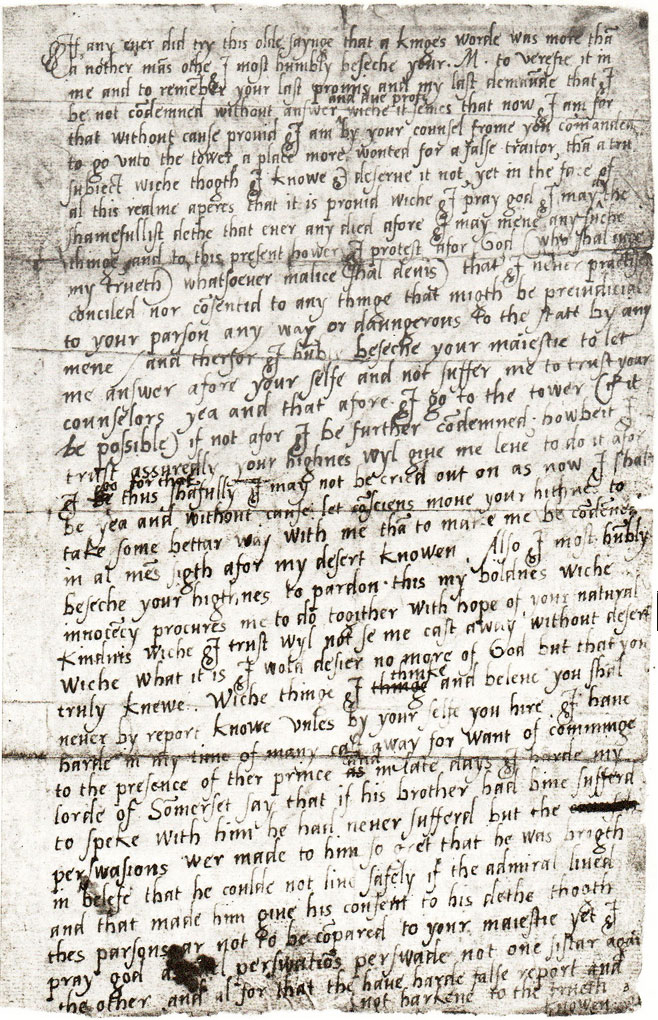 If any ever did try this old saying, 'that a king's word was more than another man's oath,' I most humbly beseech your Majesty to verify it to me, and to remember your last promise and my last demand, that I be not not condemned without answer and due proof, which it seems that I now am; for without cause proved, I am by your council from you commanded to go to the Tower, a place more wanted for a false traitor than a true subject, which though I know I desire it not, yet in the face of all this realm it appears proved. I pray to God I may die the shamefullest death that any ever died, if I may mean any such thing; and to this present hour I protest before God (Who shall judge my truth, whatsoever malice shall devise), that I never practised, counselled, nor consented to anything that might be prejudicial to your person anyway, or dangerous to the state by any means. And therefore I humbly beseech your Majesty to let me answer afore yourself, and not suffer me to trust to your Councillors, yea, and that afore I go to the Tower, if it be possible; if not, before I be further condemned. Howbeit, I trust assuredly your Highness will give me leave to do it afore I go, that thus shamefully I may not be cried out on, as I now shall be; yea, and that without cause. Let conscience move your Highness to pardon this my boldness, which innocency procures me to do, together with hope of your natural kindness, which I trust will not see me cast away without desert, which what it is I would desire no more of God but that you truly knew, but which thing I think and believe you shall never by report know, unless by yourself you hear. I have heard of many in my time cast away for want of coming to the presence of their Prince; and in late days I heard my Lord of Somerset say that if his brother had been suffered to speak with him he had never suffered; but persuasions were made to him so great that he was brought in belief that he could not live safely if the Admiral lived, and that made him give consent to his death. Though these persons are not to be compared to your Majesty, yet I pray to God the like evil persuasions persuade not one sister against the other, and all for that they have heard false report, and the truth not known. Therefore, once again, kneeling with humbleness of heart, because I am not suffered to bow the knees of my body, I humbly crave to speak with your Highness, which I would not be so bold as to desire if I knew not myself most clear, as I know myself most true. And as for the traitor Wyatt, he might peradventure write me a letter, but on my faith I never received any from him. And as for the copy of the letter sent to the French King, I pray God confound me eternally if ever I sent him word, message, token, or letter, by any means, and to this truth I will stand in till my death.
