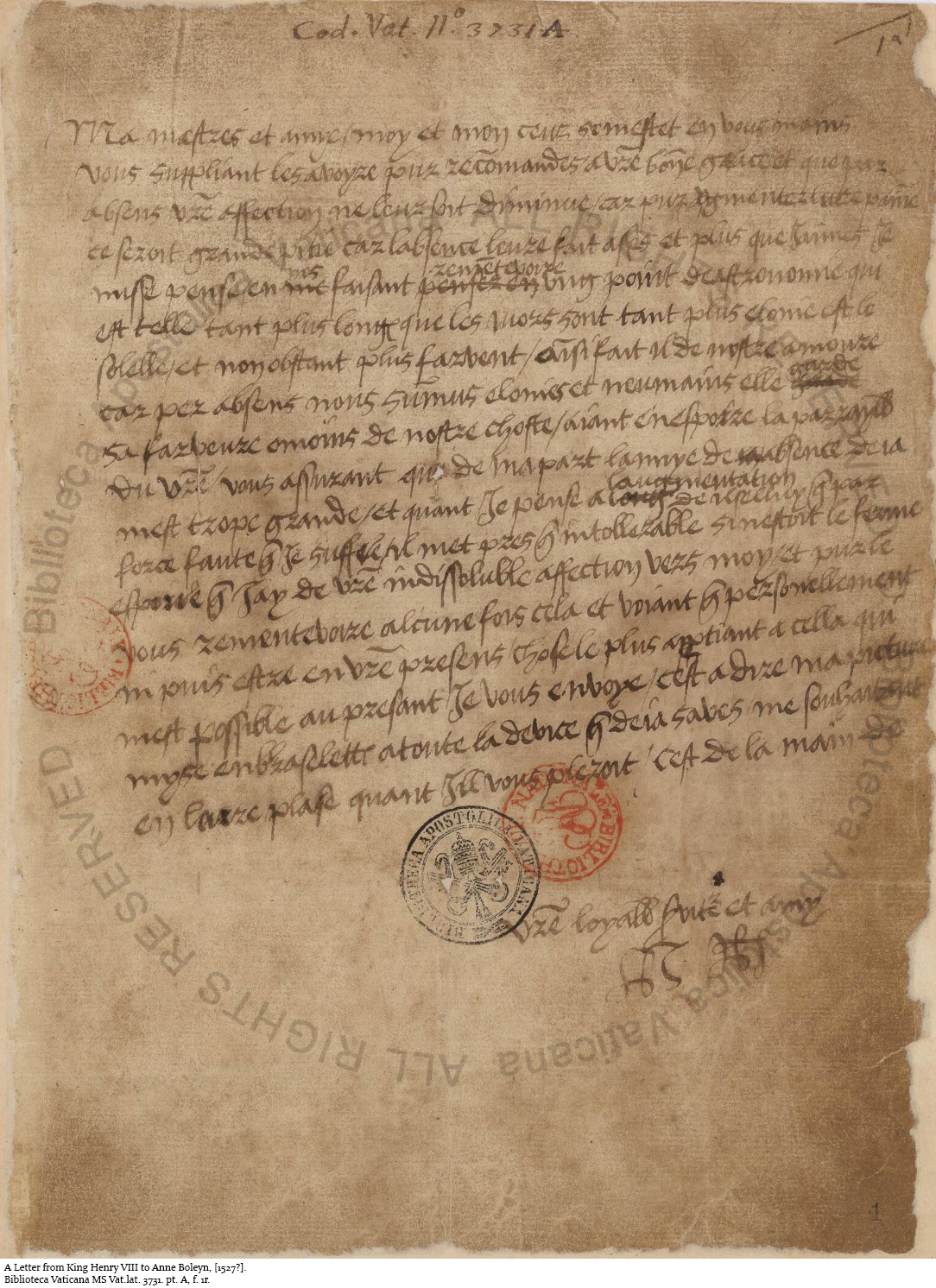 This is the first letter of Henry VIII to Anne Boleyn in the Vatican collections.