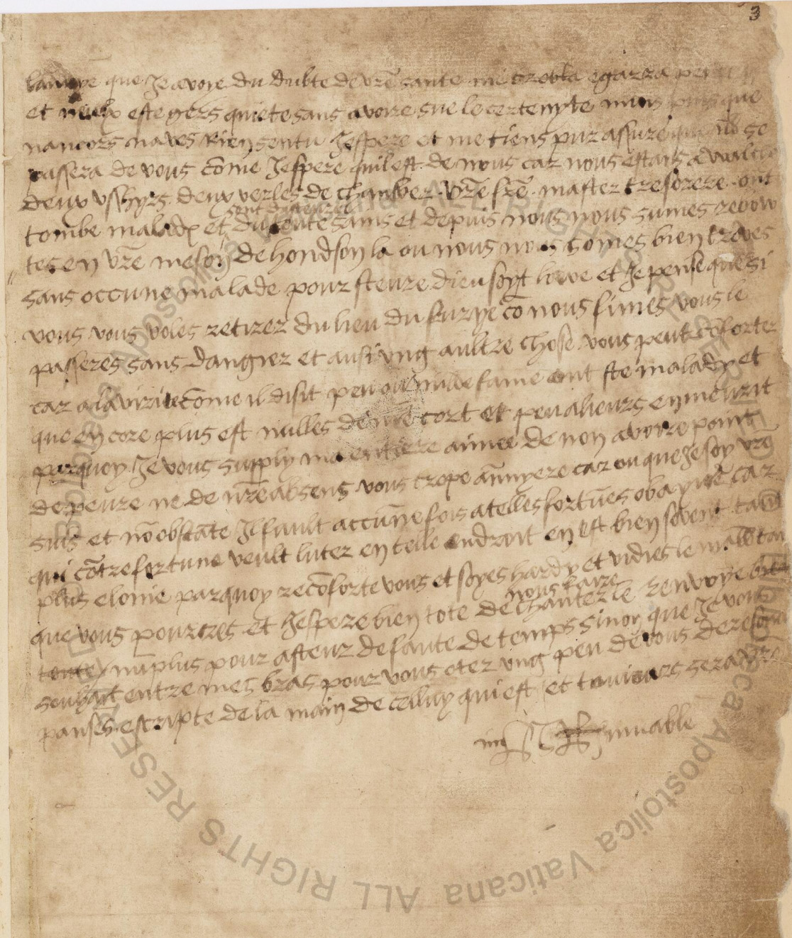 The uneasiness my doubts about your health gave me, disturbed and alarmed me exceedingly, and I should not have had any quiet without hearing certain tidings. But now, since you have as yet felt nothing, I hope, and am assured that it1 will spare you, as I hope it is doing with us. For when we were at Walton, two ushers, two valets de chambre, and your brother,2 fell ill, but are now quite well; and since we have returned to your house at Hunsdon, we have been perfectly well, and have not, at present, one sick person, God be praised; and I think, if you would retire from Surrey, as we did, you would escape all danger. There is another thing that may comfort you, which is, that, in truth, in this distemper few or no women have been taken ill, and, what is more, no person of our court, and few elsewhere, have died of it. For which reason I beg you, my entirely beloved, not to frighten yourself nor be too uneasy at our absence; for, wherever I am, I am yours, and yet we must sometimes submit to our misfortunes, for whoever will struggle against fate is generally but so much the farther from gaining his end: wherefore comfort yourself, and take courage, and avoid the pestilence as much as you can, for I hope shortly to make you sing, le renvoye. No more at present, for lack of time, but that I wish you in my arms, that I might a little dispel your unreasonable thoughts. Written by the hand of him who is and always will be yours,
