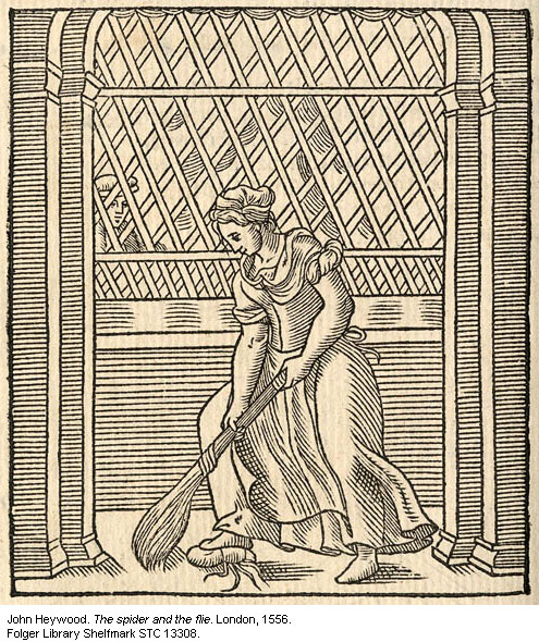 Woodcut from Spider and the Flie Heywood's other works are a collection of proverbs and epigrams, the earliest extant edition of which is dated 1562; some ballads, one of them being the "Willow Garland," known to Desdemona; and a long verse allegory of over 7000 lines entitled The Spider and the Flie (1556). A contemporary writer in Holinshed's Chronicle said that neither its author nor any one else could "reach unto the meaning thereof." But the flies are generally taken to represent the Roman Catholics and the spiders the Protestants, while Queen Mary is represented by the housemaid who with her broom (the sword) executes the commands of her master (Christ) and her mistress (the church). Dr. A.W. Ward speaks of its "general lucidity and relative variety of treatment." Heywood says that he laid it aside for twenty years before he finished it, and, whatever may be the final interpretation put upon it, it contains a very energetic statement of the social evils of the time, and especially of the deficiencies of English law.
