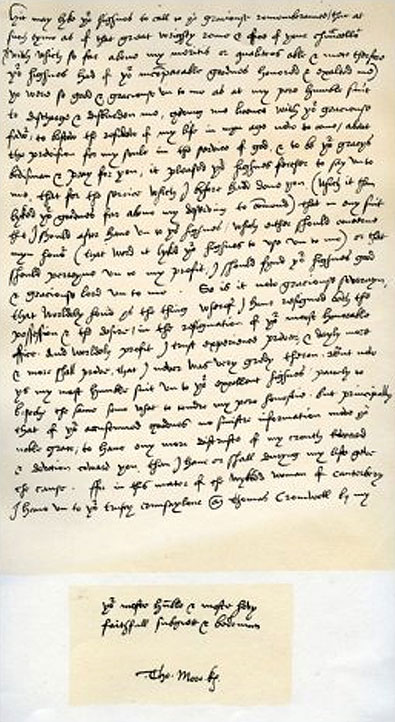 For in this mater of the wykked woman of canterbery1 I have un to yor trus[t]y counsaylour Mr Thomas Cromwell by my writing as playnly declared the trouth as I possibly can, which my declaration, of his dutie toward yor grace, and his goodnes toward me so hath I understand declared un to yor grace, in eny parte of all which my dealing, whither eny other man may peradventure put eny dowte, or move eny scrupule of suspition, that can I neither tell, nor lyeth in my hand to lett, but un to my selfe is it not possible eny parte of my said demeanure to seme evil, the very clerenes of myn owne conscience knoweth in all the mater my mynde and entent so good.