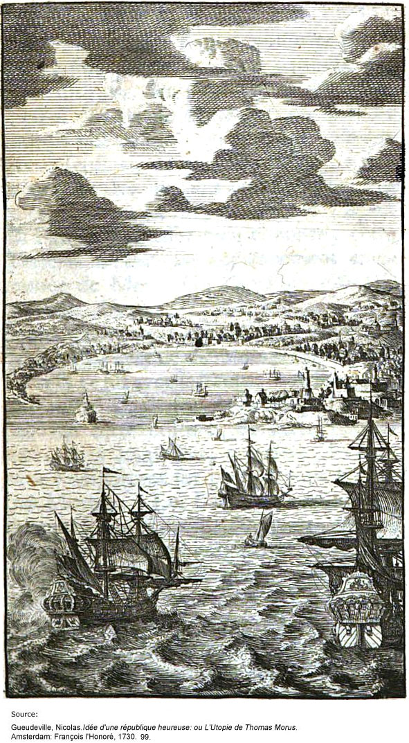 The island of Utopia is 200 miles broad in the middle, and over a great part of it, but grows narrower at either end. The figure of it is not unlike a crescent. Eleven miles breadth of sea washeth its horns and formeth a considerable bay, encompassed by a shore about 500 miles in extent, and well sheltered from storms. In the bay is no great current. The whole coast is as it were a continued harbour, affording the whole island every advantage of mutual intercourse. Yet the entrance into the bay, owing to rocks and shoals, is very dangerous.