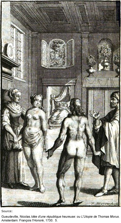 In matching, they adopt a plan which appears to us very extravagant, yet is constantly observed among them and accounted very wise. Before marriage, a grave matron presenteth the bride (be she virgin or widow) naked, to the bridegroom; and after that, some grave man presenteth the bridegroom naked to the bride. We laughed at this, and condemned it as very indecent. They, on the other hand, wondered at the folly of mankind in all other countries; who, if they buy but an inferior horse, examine him all over and take off his trappings; yet a wife, on whom dependeth the happiness of the remainder of life, they take upon trust, regarding only her face, and leaving the rest of her body covered, where contagious and loathsome disorders may lie concealed. All men are not so wise as to choose a woman only for her good qualities; and even the wise consider the body as adding not a little to the mind. It is certain the clothes may conceal some deformity which may alienate a man from his wife when it is too late to part with her. If such a thing be discovered after marriage, he hath no remedy but patience. They therefore think it reasonable, that good care should be taken to guard against such mischievous deception.
