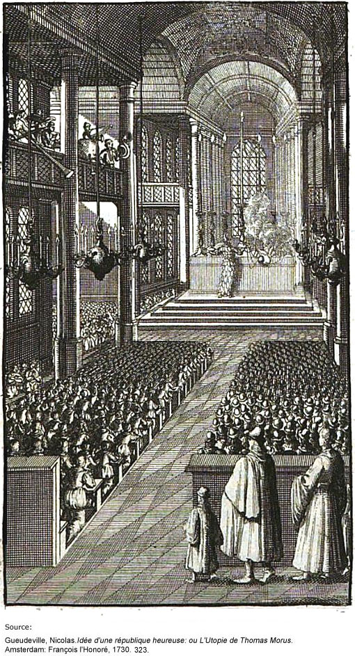 This done, priests and people offer very solemn prayers to God in a set form of words; which are so composed, that whatever is pronounced by the whole assembly may be applied by any individual to himself. In these they acknowledge God to be the author and governor of the world, and the fountain of all the good they receive; they therefore offer him their thanksgiving. In particular, they bless him that they are born under the happiest government in the world, and are of a religious persuasion which they hope is the truest of all others. Be they mistaken, and there is a better government, or a religion more acceptable to him, they implore his goodness to let them know it; vowing that they resolve to follow him whithersoever he leadeth. But if their government be the best and their religion the truest, they pray that he may strengthen them therein, and bring all the world to the same rules of life and the same opinions of himself; unless, in his unsearchable wisdom, he be pleased with a variety of religions.